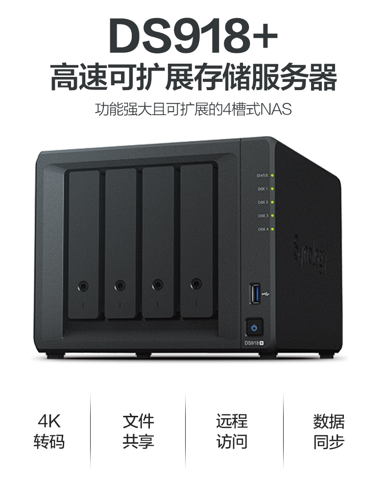 DS918+ 支持多達(dá)兩個 M.2 NVMe 2280 SSD,無需占用內(nèi)部硬盤插槽即可快速創(chuàng)建系統(tǒng)緩存。DS918+ 可通過 Synology 擴(kuò)充設(shè)備 DX517 擴(kuò)展到多達(dá) 9 個硬盤,滿足了對靈活存儲容量的需求。
